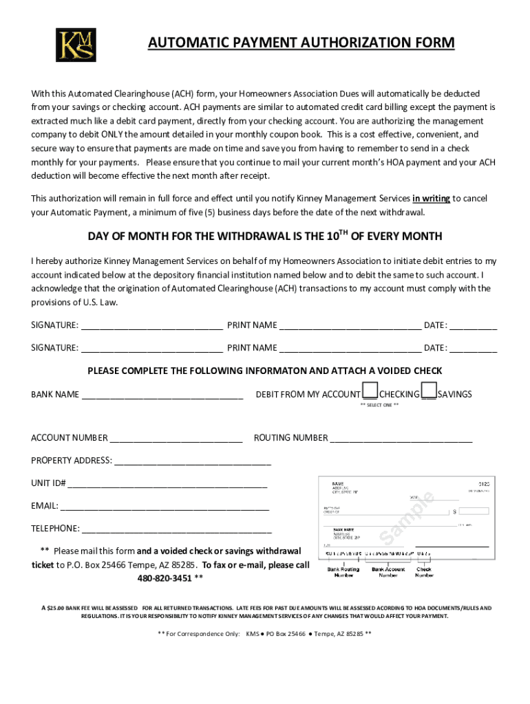 AUTOMATICPAYMENTAUTHORIZATIONFORM WiththisAutomatedClearinghouse(ACH)form, yourHomeownersAssociationDueswillautomaticallybededucted fromyoursavingsorcheckingaccount.ACHpaymentsaresimilartoautomatedcreditcardbillingexceptthepaymentis