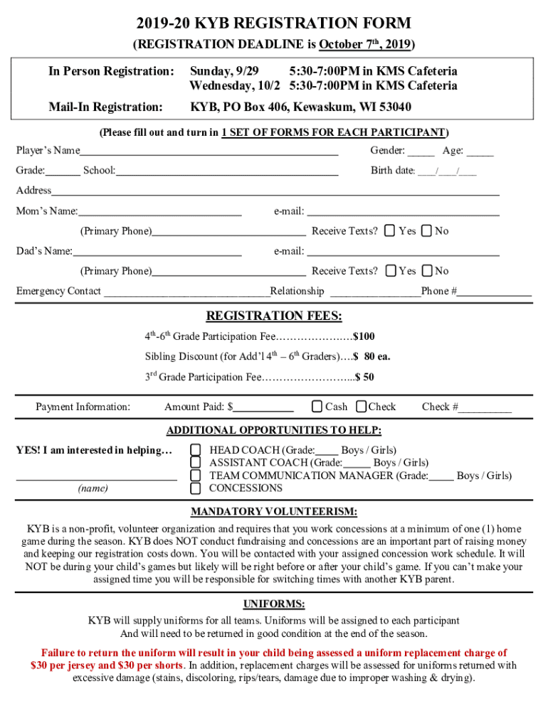 201920 KGB REGISTRATION FORM (REGISTRATION DEADLINE is October 7th, 2019) In Person Registration:Sunday, 9/29 5:307:00PM in KMS Cafeteria Wednesday, 10/2 5:307:00PM in KMS CafeteriaMailIn Registration:KGB,