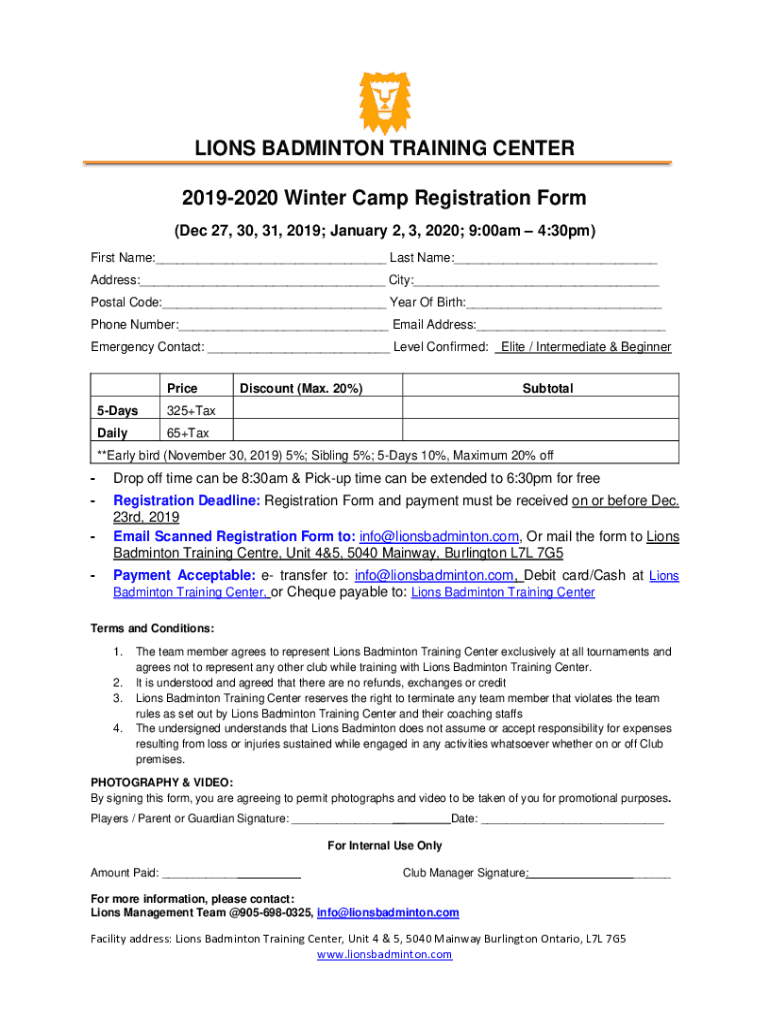LIONS BADMINTON TRAINING CENTER 20192020 Winter Camp Registration Form (Dec 27, 30, 31, 2019; January 2, 3, 2020; 9:00am 4:30pm) First Name: Last Name: Address: City: Postal Code: Year Of Birth: Phone