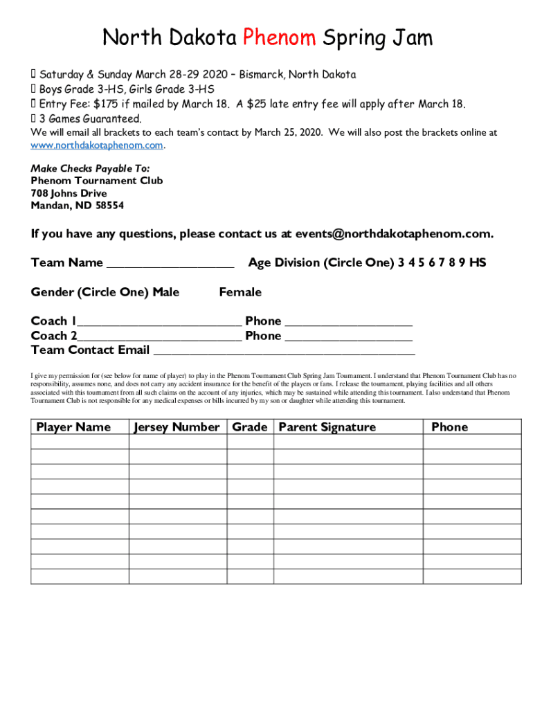 North Dakota Phenom Spring Jam Saturday & Sunday March 2829 2020 Bismarck, North Dakota Boys Grade 3HS, Girls Grade 3HS Entry Fee: $175 if mailed by March 18. A $25 late entry fee will apply after