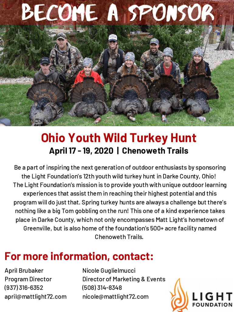 Become a Sponsor Ohio Youth Wild Turkey Hunt April 17 19, 2020 Chenoweth Trails Be a part of inspiring the next generation of outdoor enthusiasts by sponsoring the Light Foundations 12th youth wild