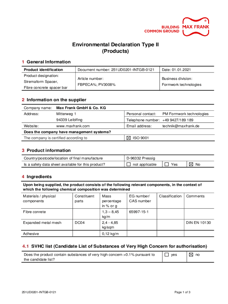Environmental Declaration Type II (Products) 1 General Information Product identification Product designation: Terraform Spacer, Fiber concrete spacer document number: 251UD0201INTGB0121Date: 01.01.2021Article