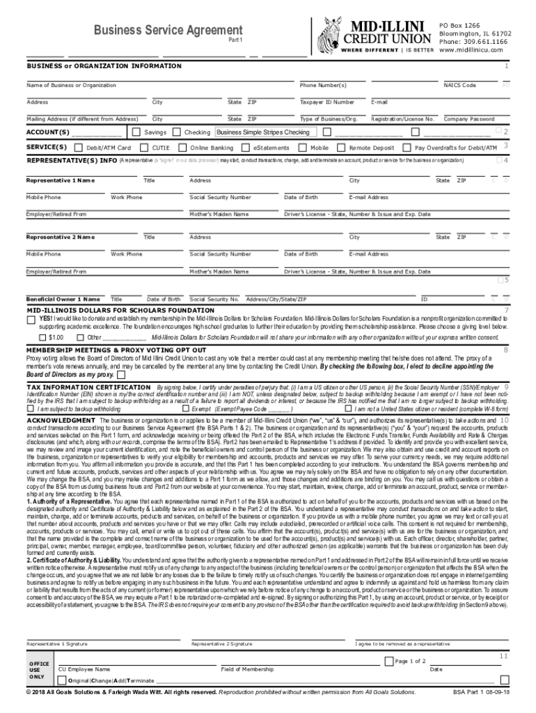 PO Box 1266 Bloomington, IL 61702 Phone: 309.661.1166 www.midillinicu.comBusiness Service AgreementPart 11BUSINESS or ORGANIZATION Informational of Business or OrganizationPhone Number(s)AddressCityStateZIPTaxpayer