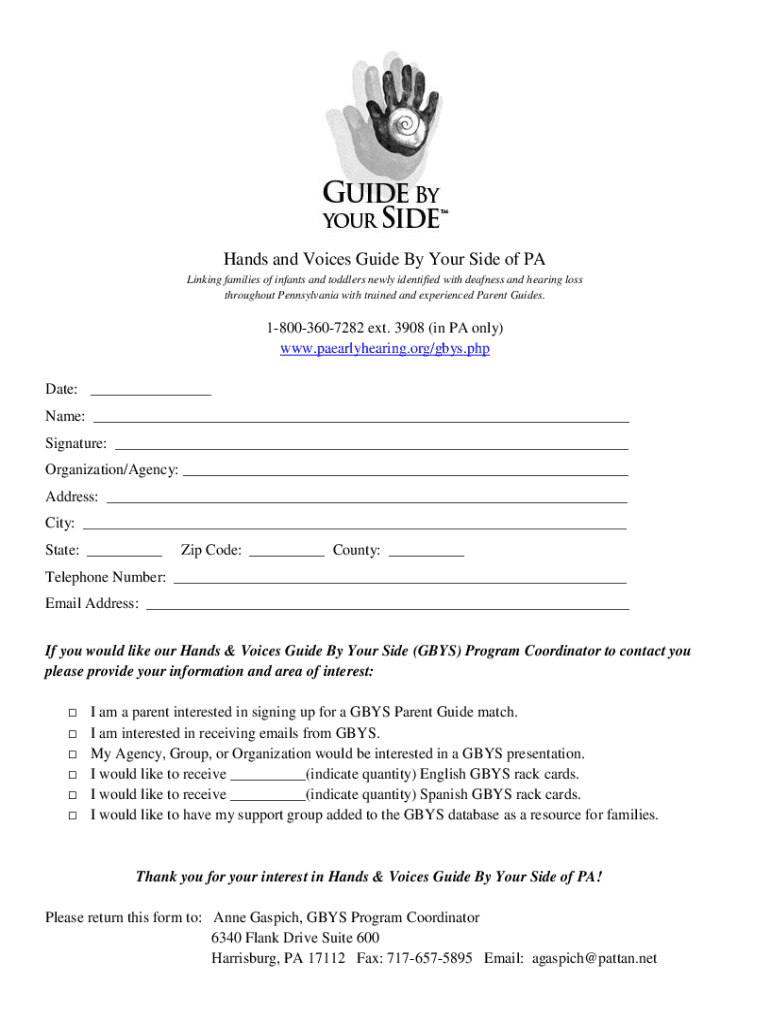 Hands and Voices Guide By Your Side of PA Linking families of infants and toddlers newly identified with deafness and hearing loss throughout Pennsylvania with trained and experienced Parent Guides.18003607282