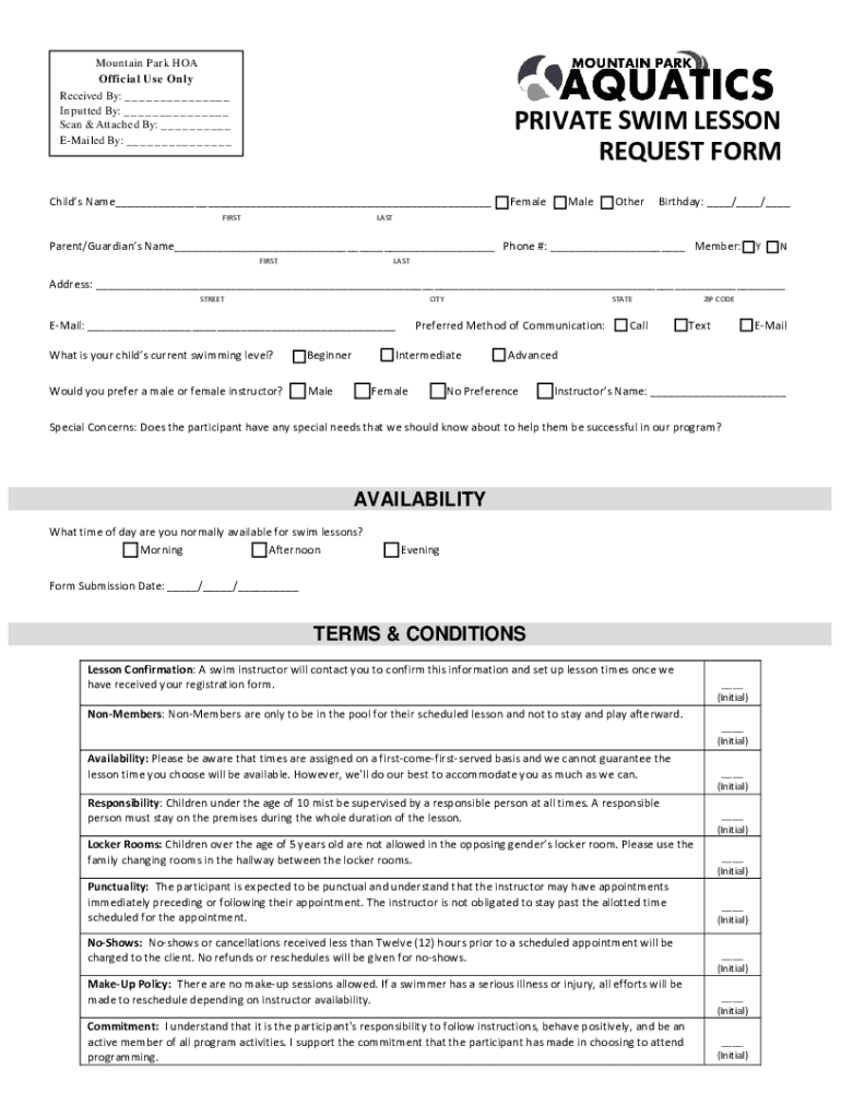 Mountain Park HOA Official Use Only Received By: Inputted By: Scan & Attached By: Emailed By: PRIVATE SWIM LESSON REQUEST Orchids Name Female Male Other FIRSTBirthday: / / Apparent/Guardians Name