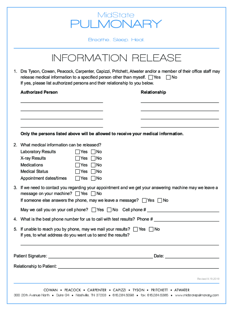 Breathe. Sleep. Heal.INFORMATION RELEASE 1. D rs Tyson, Conan, Peacock, Carpenter, Capital, Pritchett, At water and/or a member of their office staff may release medical information to a specified