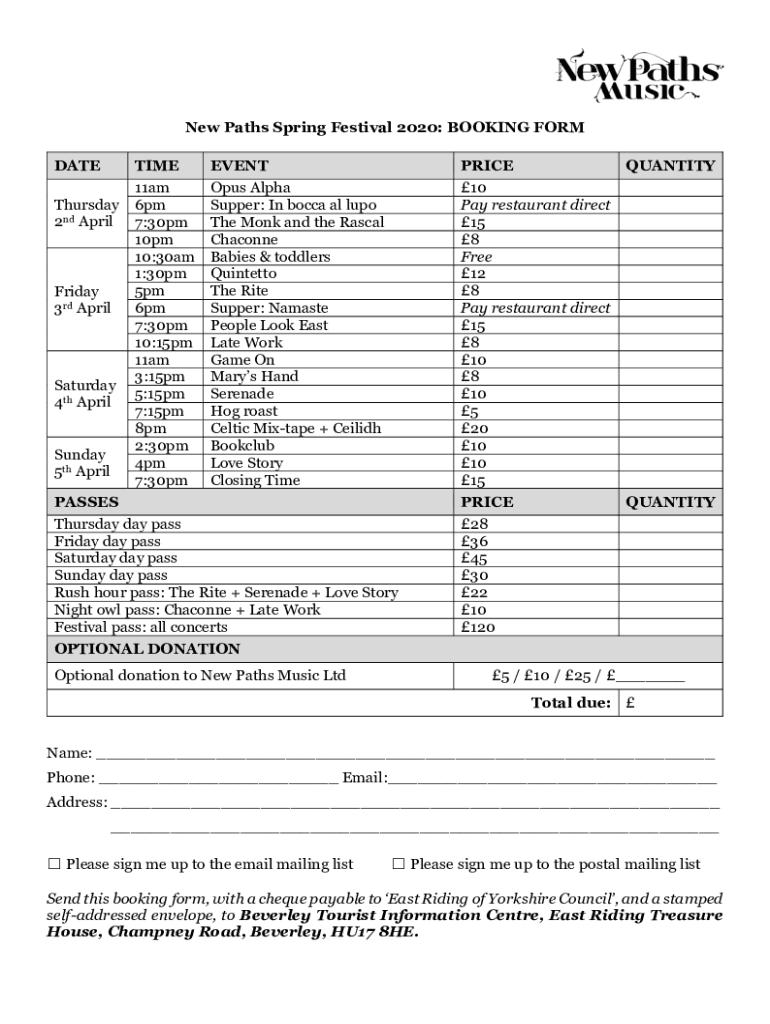 New Paths Spring Festival 2020: BOOKING FORM DATE TIME 11am Thursday 6pm 2nd April 7:30pm 10pm 10:30am 1:30pm 5pm Friday rd 3 April 6pm 7:30pm 10:15pm 11am 3:15pm Saturday 5:15pm 4th April 7:15pm