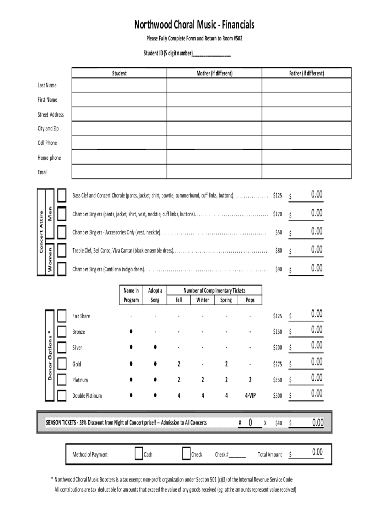 North wood Choral Music Financials Please Fully Complete Form and Return to Room #502Student ID (5-digit number) StudentMother (if different)Father (if different)Last Name First Name Street Address