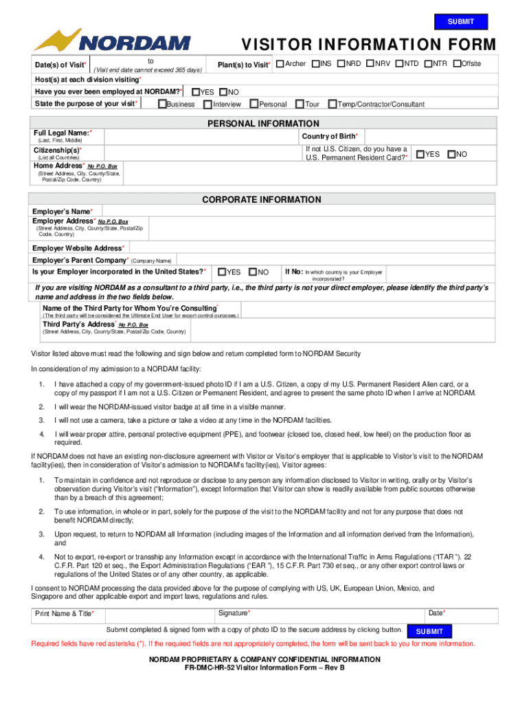 SUBMITVISITOR INFORMATION FORM Date(s) of Visit×plant(s) to Visit* Archer INS NRL NTD NTR Offsite(Visit end date cannot exceed 365 days)Host(s) at each division visiting* Have you ever been employed