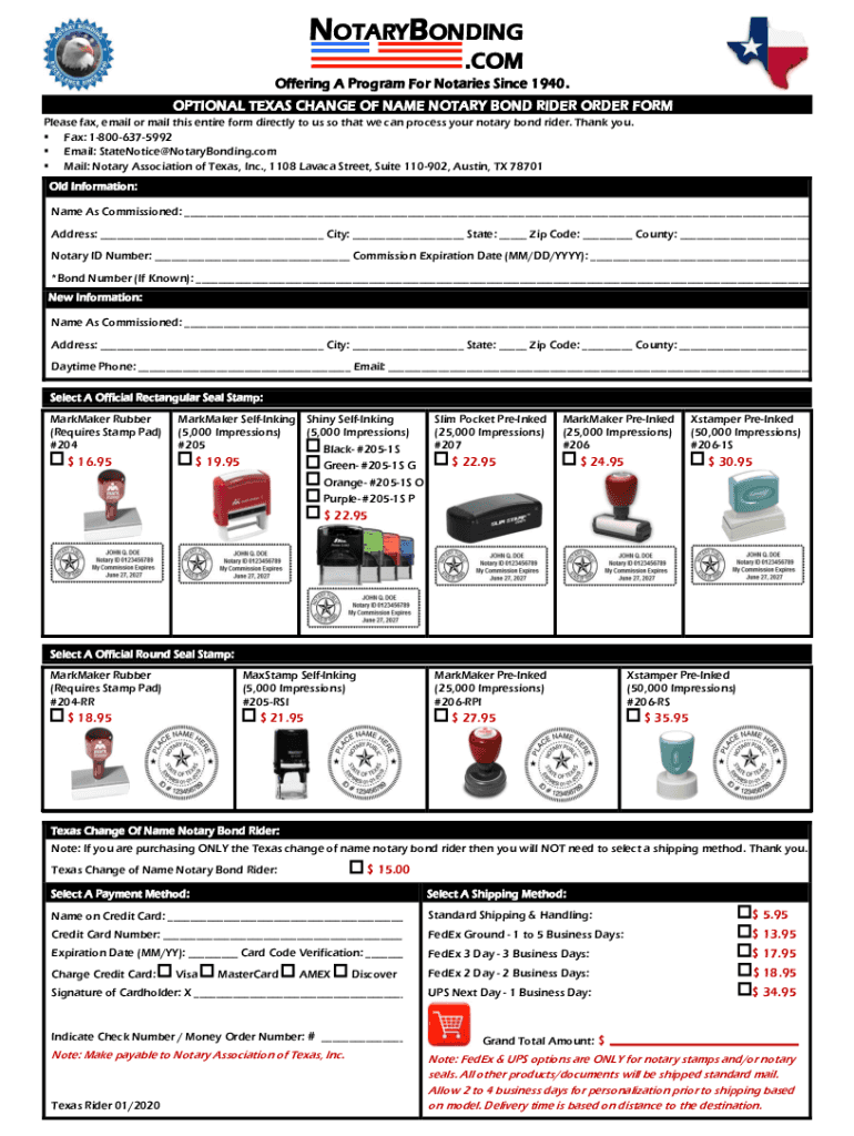 NOTARYBONDING .COM Offering A Program For Notaries Since 1940. OPTIONAL TEXAS CHANGE OF NAME NOTARY BOND RIDER ORDER FORM Please fax, email or mail this entire form directly to us so that we can process