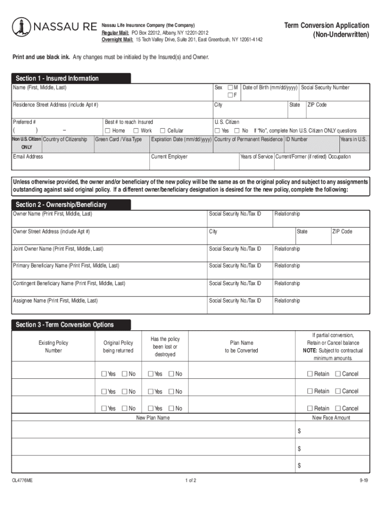 Nassau Life Insurance Company (the Company)Regular Mail: PO Box 22012, Albany, NY 122012012 Overnight Mail: 15 Tech Valley Drive, Suite 201, East Green bush, NY 120614142Term Conversion Application