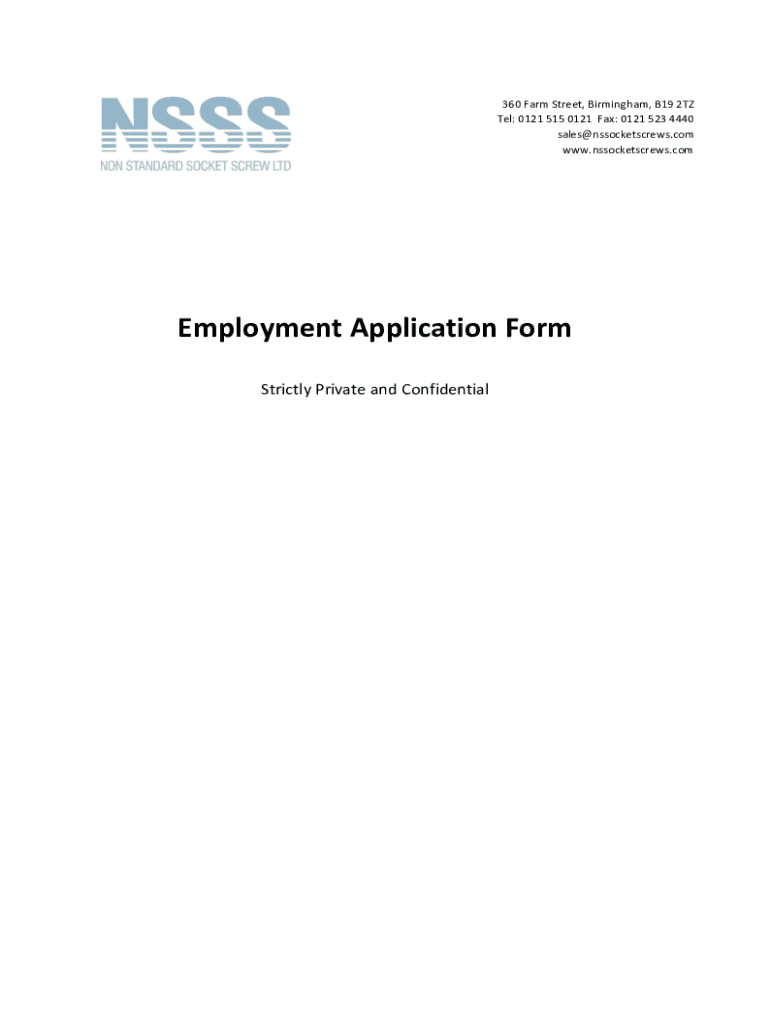 360 Farm Street, Birmingham, B19 2TZ Tel: 0121 515 0121 Fax: 0121 523 4440 sales nssocketscrews.com www.nssocketscrews.comEmployment Application Form Strictly Private and ConfidentialSection 1 Your