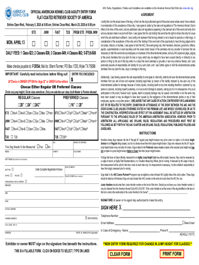 OFFICIAL AMERICAN KENNEL CLUB AGILITY ENTRY FORM FLATFOOTED RETRIEVER SOCIETY OF AMERICA Entries Open Wed., February 5, 2020, at 8:00 am; Entries Close Wed., March 25, 2020, at 6:00 pmSTDJWWMON, APRIL
