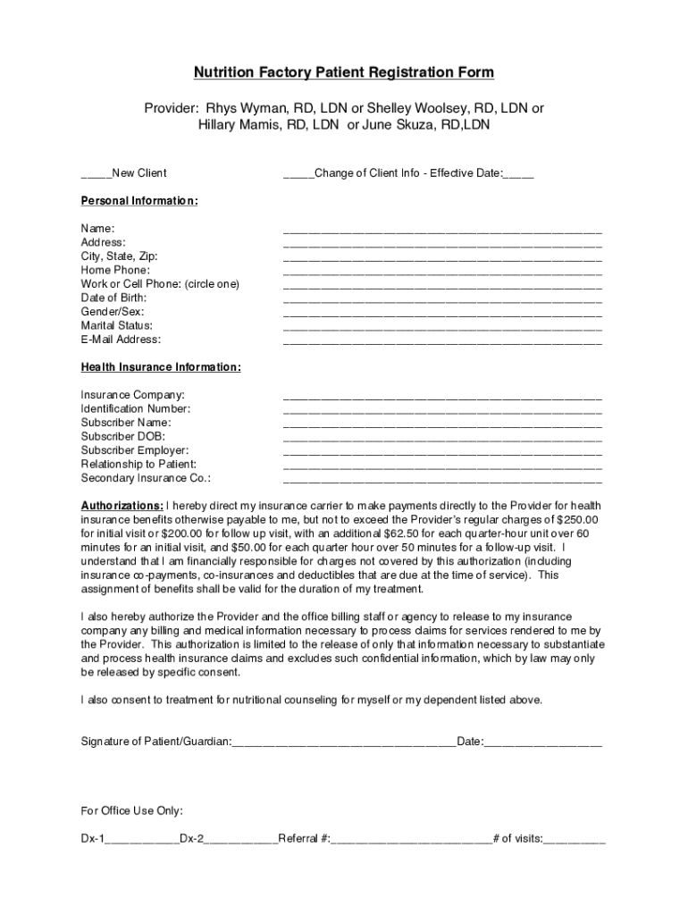 Nutrition Factory Patient Registration Form Provider: Rays Woman, RD, LD Nor Shelley Wolsey, RD, LD Nor Hillary Maris, RD, LD Nor June Skua, RD, LIN New Client Change of Client Info Effective Date: