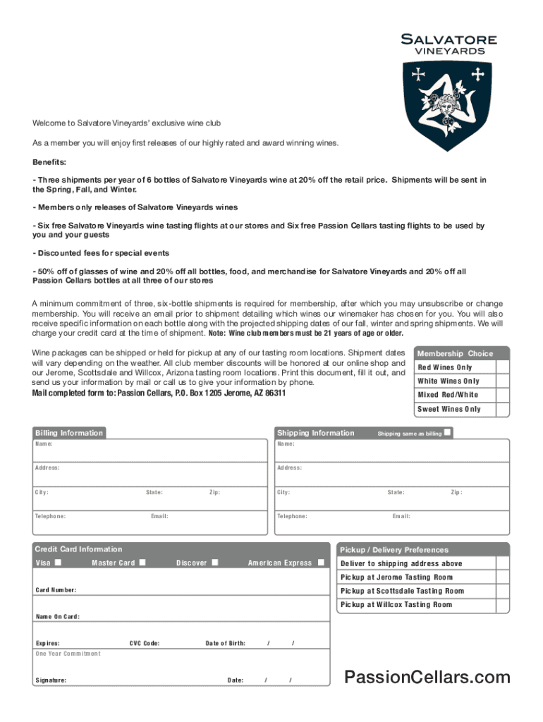 The Salvatore Wine Club form is a registration document used by individuals or entities to enroll in a wine club, offering membership benefits such as discounts on purchases, exclusive access to events, and curated wine selections.