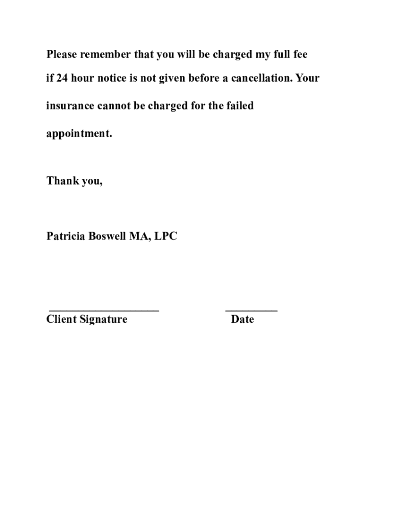 Please remember that you will be charged my full fee if 24-hour notice is not given before a cancellation. Your insurance cannot be charged for the failed appointment. Thank you, Patricia Boswell
