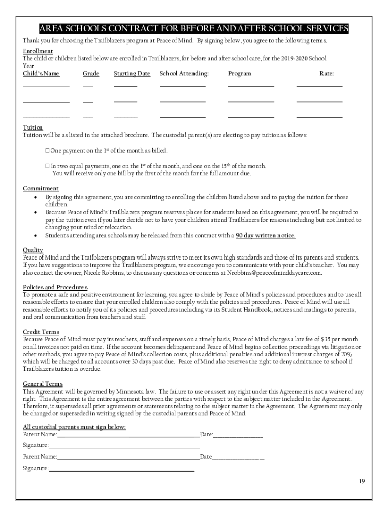 AREA SCHOOLS CONTRACT FOR BEFORE AND AFTER SCHOOL SERVICES Thank you for choosing the Trailblazers program at Peace of Mind. By signing below, you agree to the following terms. Enrollment The child