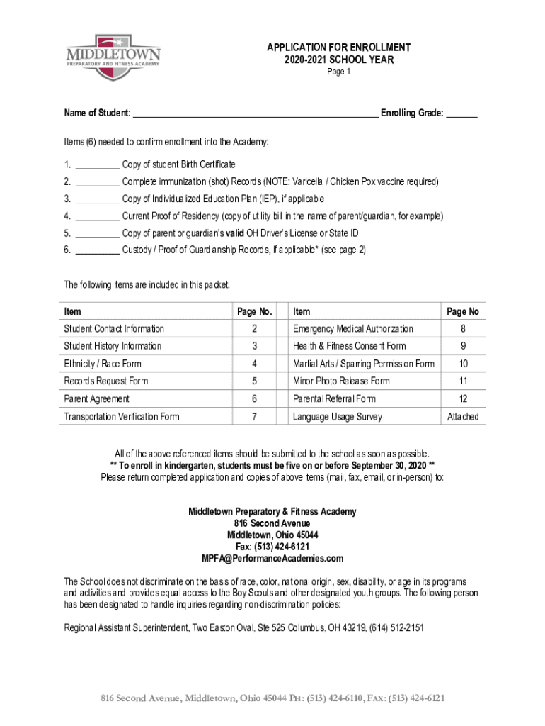 APPLICATION FOR ENROLLMENT 20202021 SCHOOL YEAR Page 1Name of Student: Enrolling Grade: Items (6) needed to confirm enrollment into the Academy: 1. Copy of student Birth Certificate 2. Complete immunization