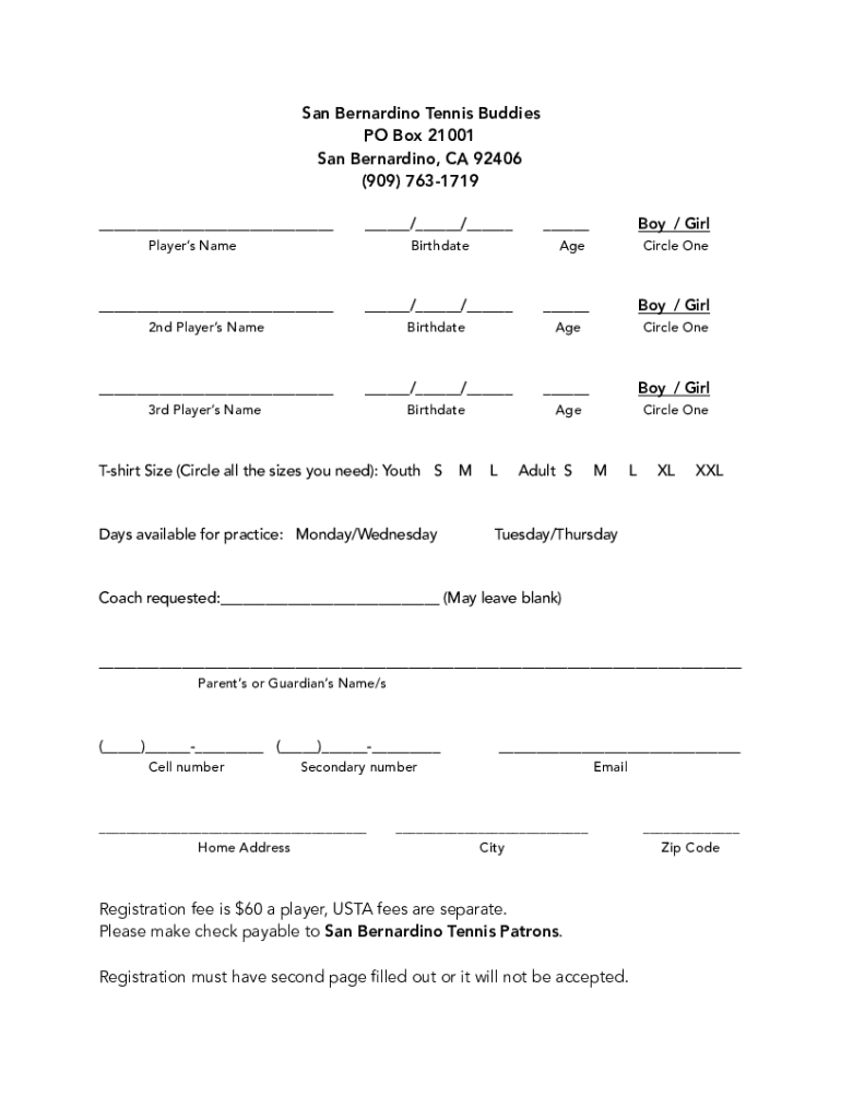 San Bernardino Tennis Buddies PO Box 21001 San Bernardino, CA 92406 (909) 7631719 / / Boy / GirlAgeCircle One / / Boy / GirlBirthdateAgeCircle One / / Boy / GirlBirthdateAgeCircle Players NameBirthdate