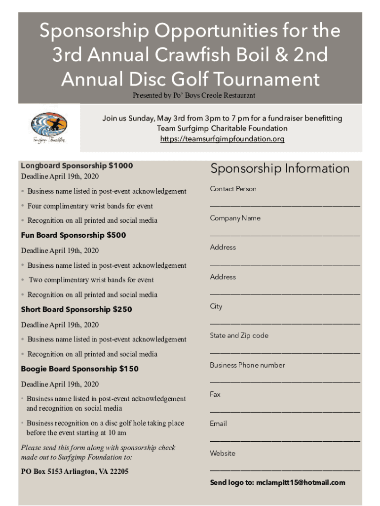 Sponsorship Opportunities for the 3rd Annual Crawfish Boil & 2nd Annual Disc Golf Tournament Presented by Po Boys Creole RestaurantJoin us Sunday, May 3rd from 3pm to 7 pm for a fundraiser benefitting