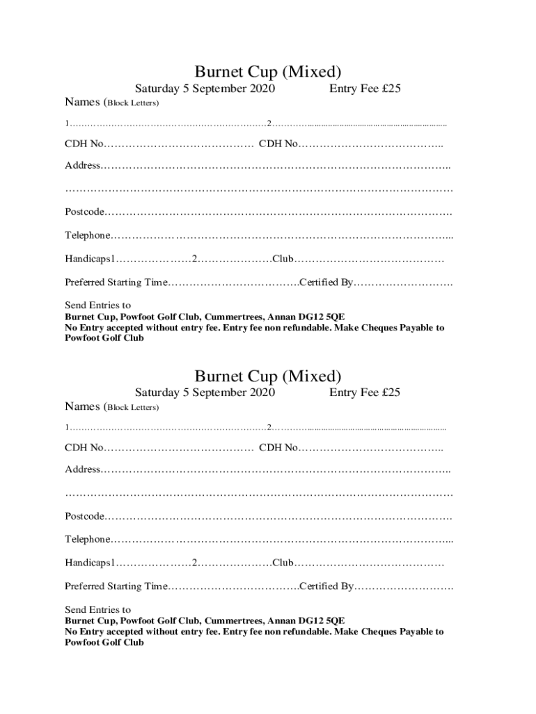 Burned Cup (Mixed) Saturday 5 September 2020Entry Fee 25Names (Block Letters) 12..............................................................CDH No. Address. Postcode