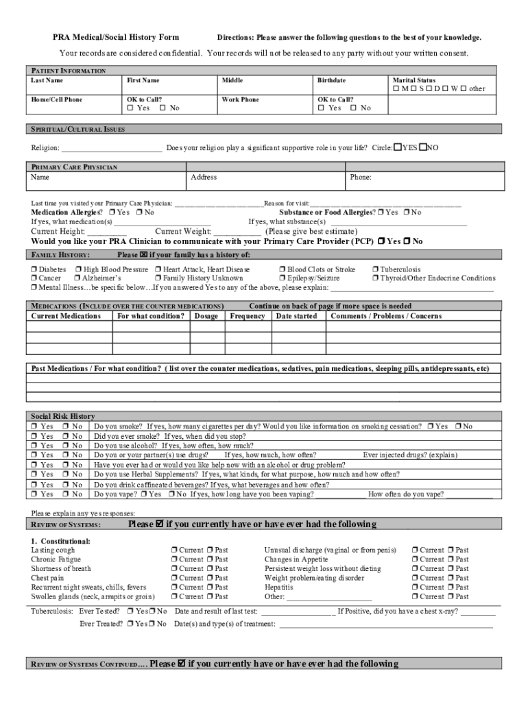PRA Medical/Social History Redirections: Please answer the following questions to the best of your knowledge. Your records are considered confidential. Your records will not be released to any party