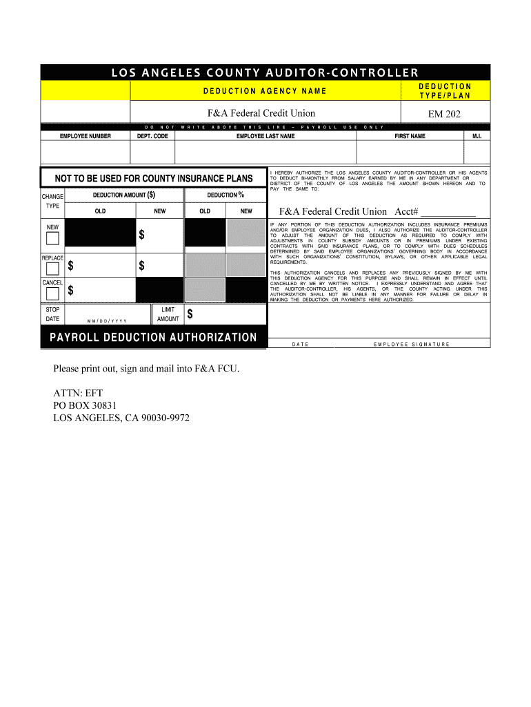 Any employee in Los Angeles County who wishes to authorize salary deductions for insurance premiums, union dues, or other purposes can fill out this form.