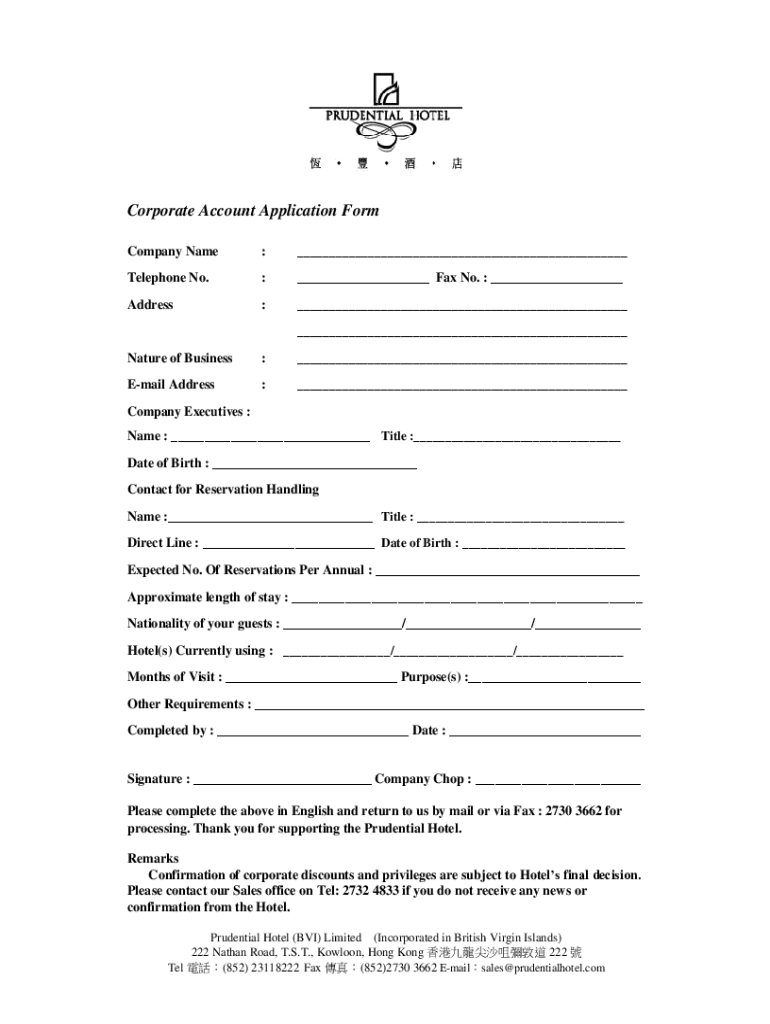 Corporate Account Application Form Company Name: Telephone No.: Fax No. Address: Nature of Business: Email Address: Company Executives : Name : Title : Date of Birth : Contact for Reservation Handling
