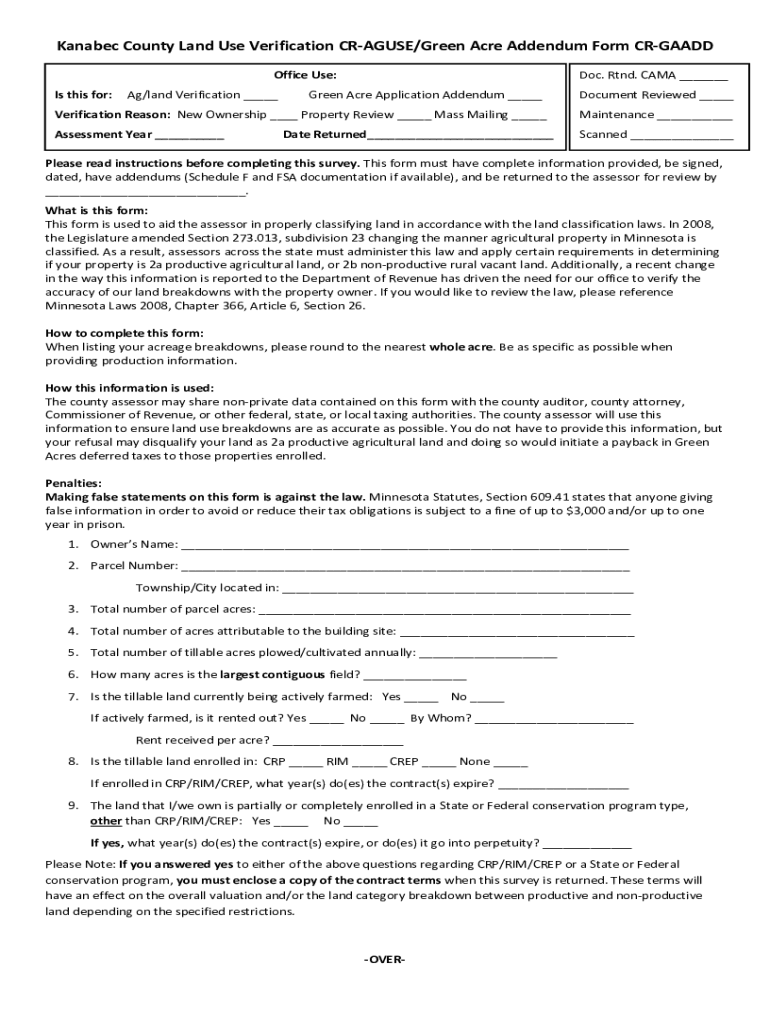Anabel County Land Use Verification CRAG USE/Green Acre Addendum Form CREATED Office Use: Is this for:Ag/land Verification Doc. Rand. CAME Green Acre Application Addendum Document Reviewed Verification