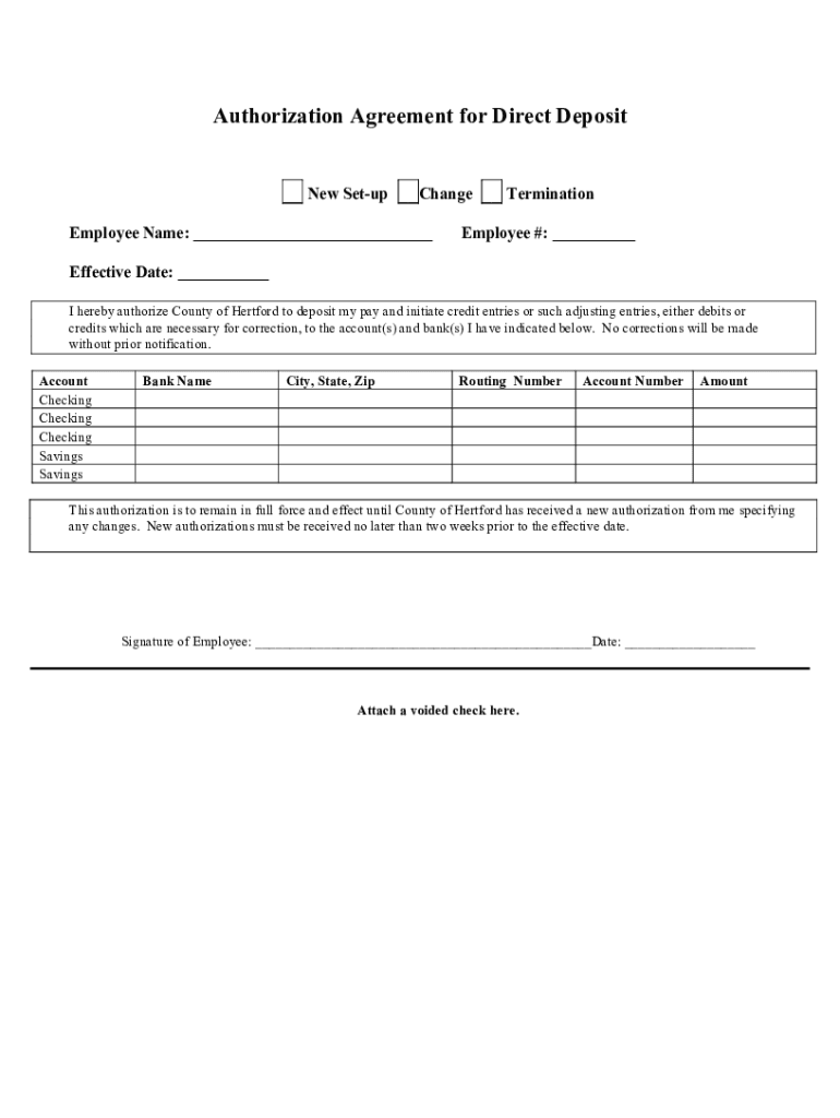 Authorization Agreement for Direct Deposit New Setup Change Termination Employee Name: Employee #: Effective Date: I hereby authorize County of Hartford to deposit my pay and initiate credit entries