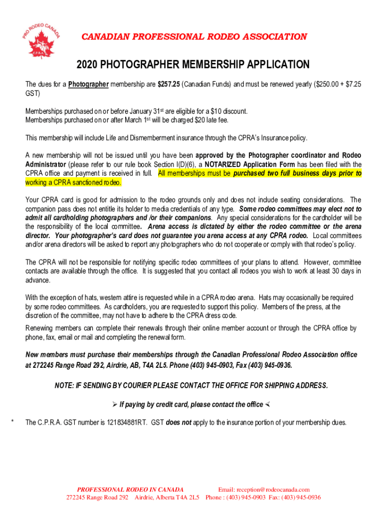 CANADIAN PROFESSIONAL RODEO ASSOCIATION2020 PHOTOGRAPHER MEMBERSHIP APPLICATION