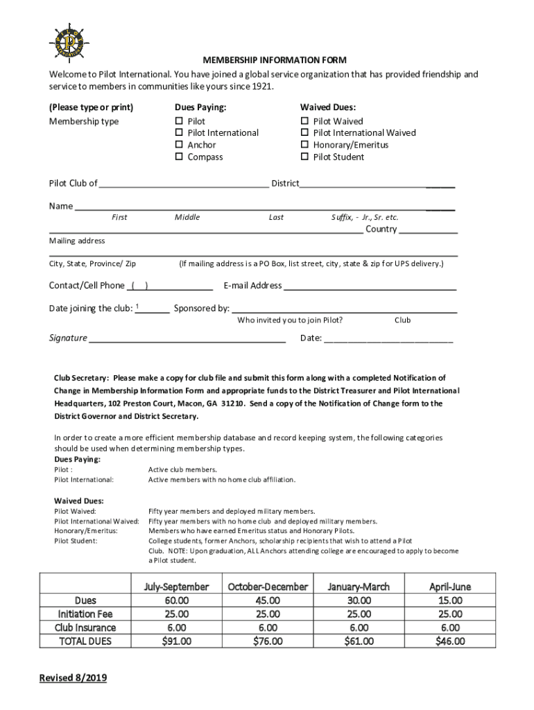 MEMBERSHIP INFORMATION FORM Welcome to Pilot International. You have joined a global service organization that has provided friendship and service to members in communities like yours since 1921.