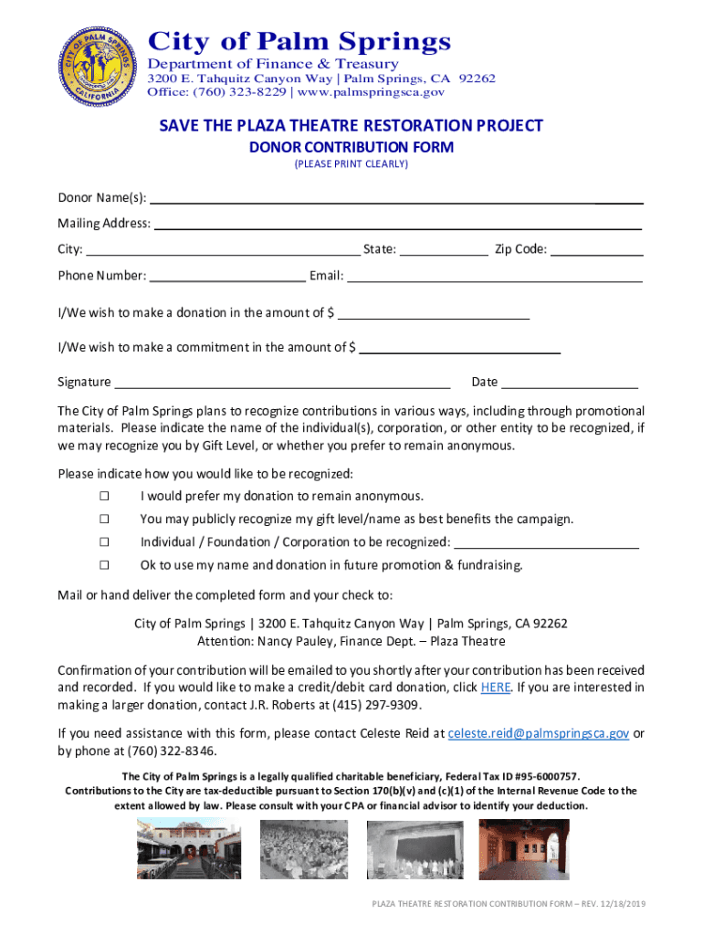 City of Palm Springs Department of Finance & Treasury 3200 E. Tahiti Canyon Way Palm Springs, CA 92262 Office: (760) 3238229 www.palmspringsca.govSAVE THE PLAZA Theater RESTORATION PROJECT DONOR CONTRIBUTION