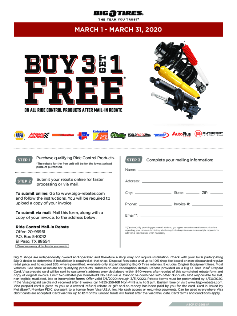 MARCH 1 MARCH 31, 2020Get up to $100* with purchase & installation of qualifying ride control products after mailing rebate. STEP 1Purchase qualifying Ride Control Products. *The rebate for the free