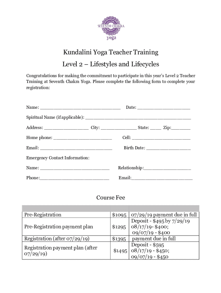 Kundalini Yoga Teacher Training Level 2 Lifestyles and Lifecycles Congratulations on making the commitment to participate in this year's Level 2 Teacher Training at Seventh Chakra Yoga. Please complete