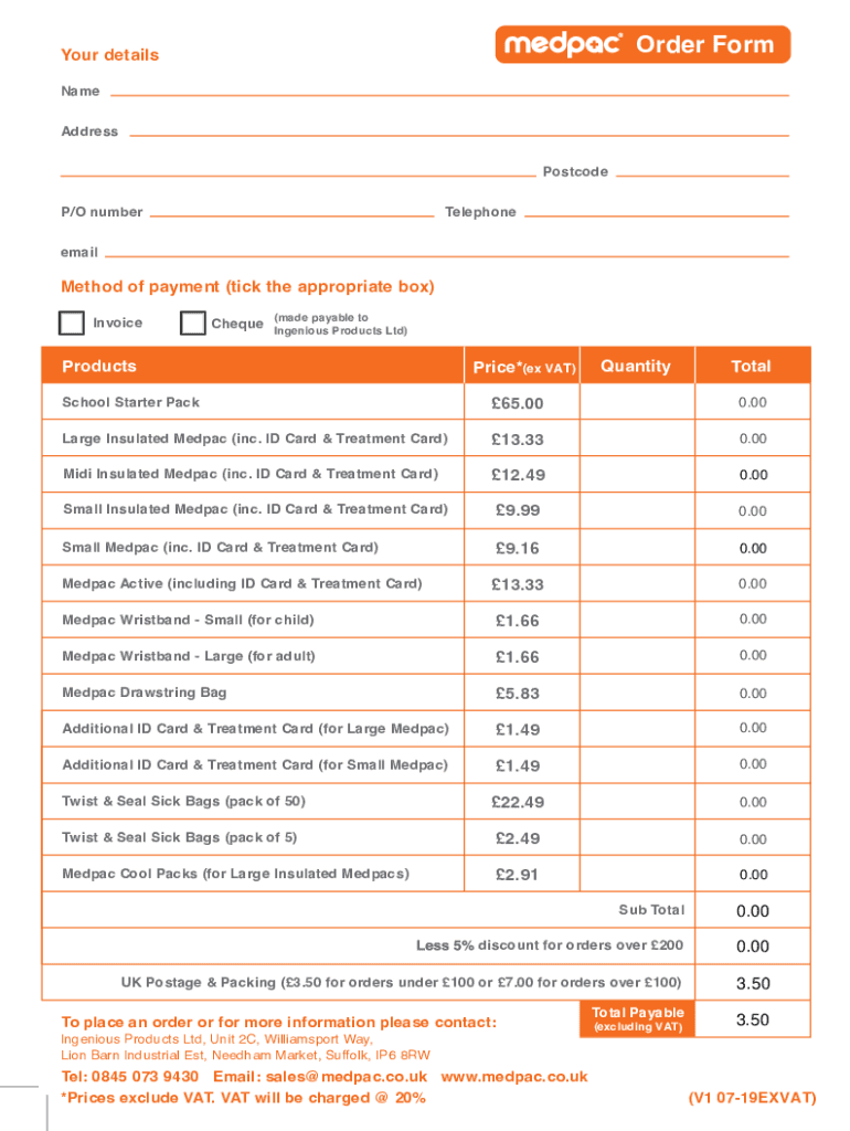 Order Former details Name Address Postcode P/O numberTelephoneemailMethod of payment (tick the appropriate box) InvoiceCheque(made payable to Ingenious Products Ltd)Products voice Price*(ex VA)QuantityTotalSchool