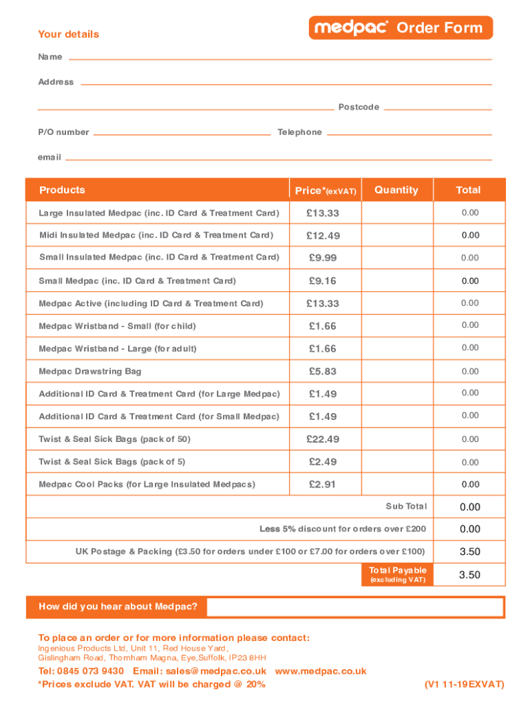 Order Former details Name Address Postcode P/O numberTelephoneemailProductsPrice*(expat)QuantityTotalLarge Insulated Median (inc. ID Card & Treatment Card)13.330.00Midi Insulated Median (inc. ID Card