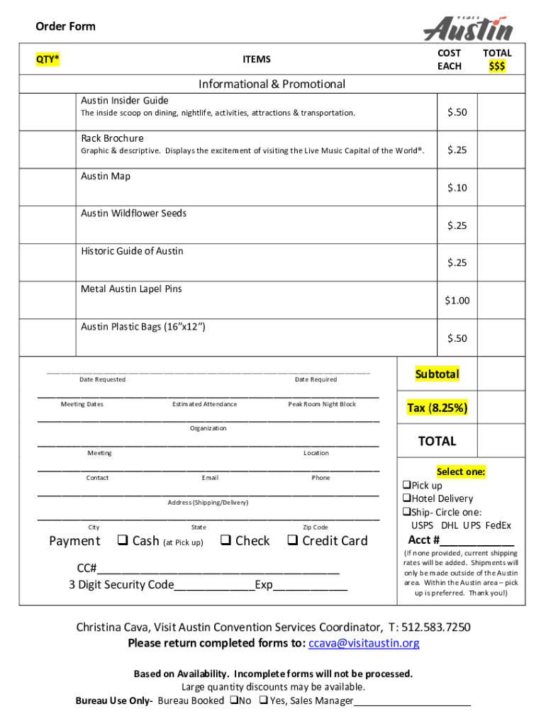 Order Format×COSTEACHITEMSTOTAL$$$Informational & Promotional Austin Insider Guide.50The inside scoop on dining, nightlife, activities, attractions & transportation. Rack BrochureGraphic & descriptive.