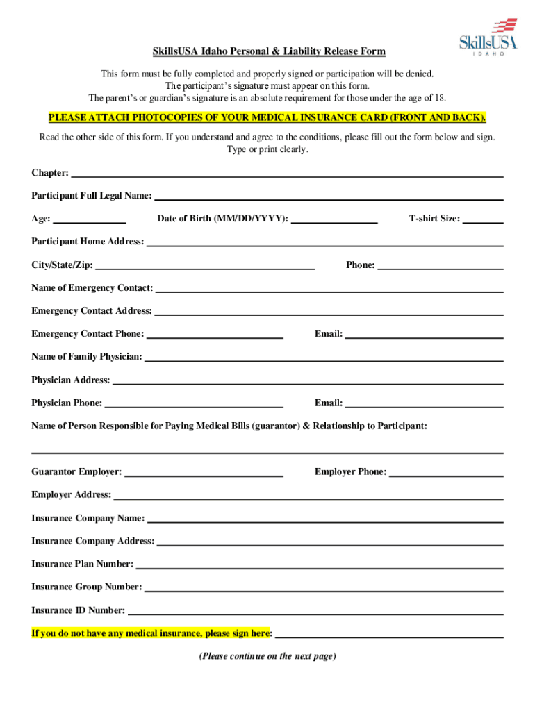 Skills USA Idaho Personal & Liability Release Form This form must be fully completed and properly signed or participation will be denied. The participants' signature must appear on this form. The