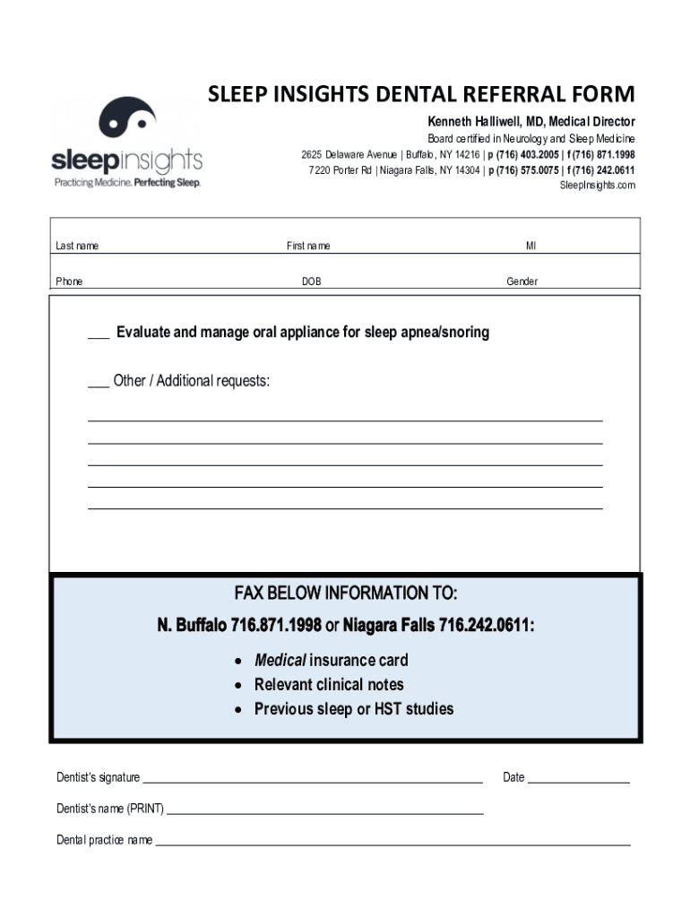 SLEEP INSIGHTS DENTAL REFERRAL FORM Kenneth Caldwell, MD, Medical Director Board certified in Neurology and Sleep Medicine 2625 Delaware Avenue Buffalo, NY 14216 p (716) 403.2005 f (716) 871.1998