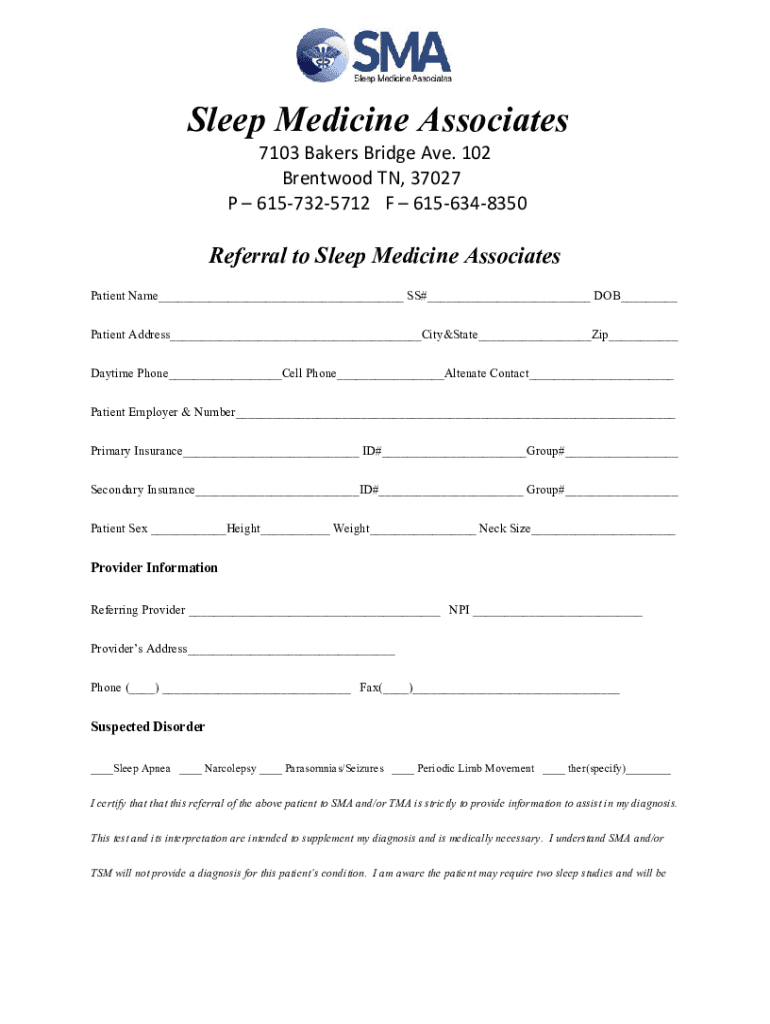 Sleep Medicine Associates 7103 Bakers Bridge Ave. 102 Brentwood TN, 37027 P 6157325712 F 6156348350Referral to Sleep Medicine Associates Patient Name SS# DOB Patient Address Cityscape Zip Daytime