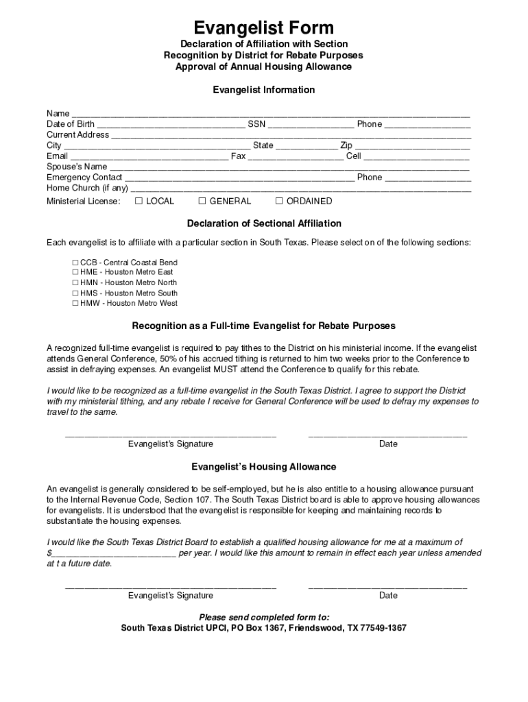 Evangelist Form Declaration of Affiliation with Section Recognition by District for Rebate Purposes Approval of Annual Housing Allowance Evangelist Information Name Date of Birth SSN Phone Current