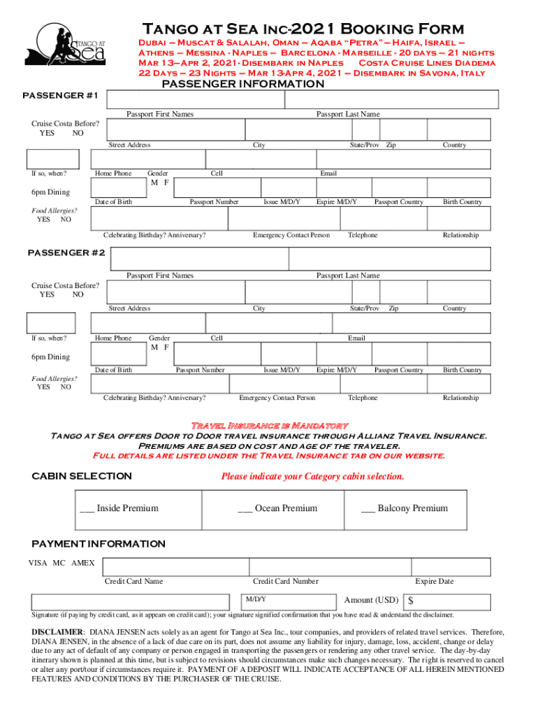 Tango at Sea Inc2021 Booking Form Dubai Muscat & Allah, Oman Arab Petra Haifa, Israel Athens Messina Naples Barcelona Marseille 20 days 21 nights Mar 13Apr 2, 2021 Disembark in Naples Costa Cruise