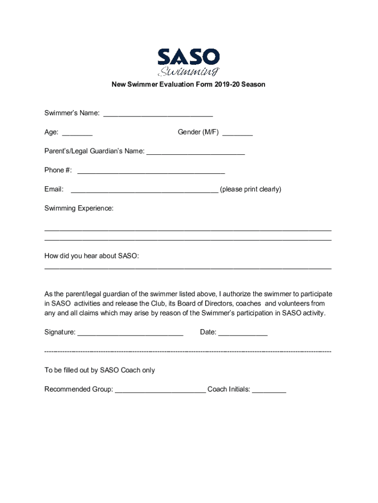 New Swimmer Evaluation Form 201920 SeasonSwimmers Name: Age: Gender (M/F) Parents/Legal Guardians Name: Phone #: Email: (please print clearly)Swimming Experience: How did you hear about SAS: As the