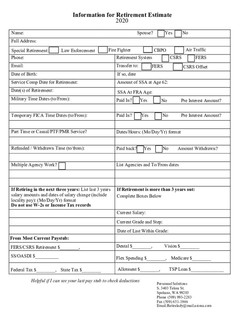 Information for Retirement Estimate 2020 Name:Spouse? YesNoFull Address: Special Retirement: Law Enforcement Phone:Air Traffic CAPO Retirement System CARS Perspire FighterEmail:Transfer to:Date of