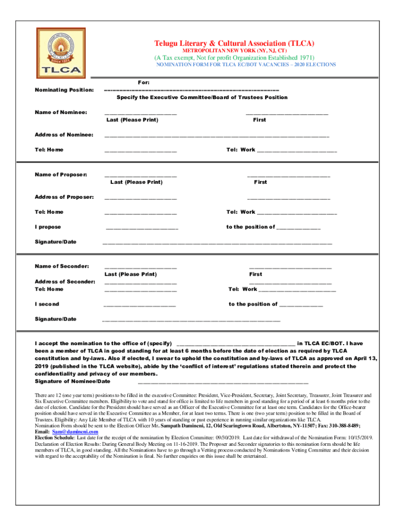 Telugu Literary & Cultural Association (TLC) METROPOLITAN NEW YORK (NY, NJ, CT)(A Tax exempt, Not for profit Organization Established 1971) NOMINATION FORM FOR TLC AEC/BOT VACANCIES 2020 ELECTIONSNominating