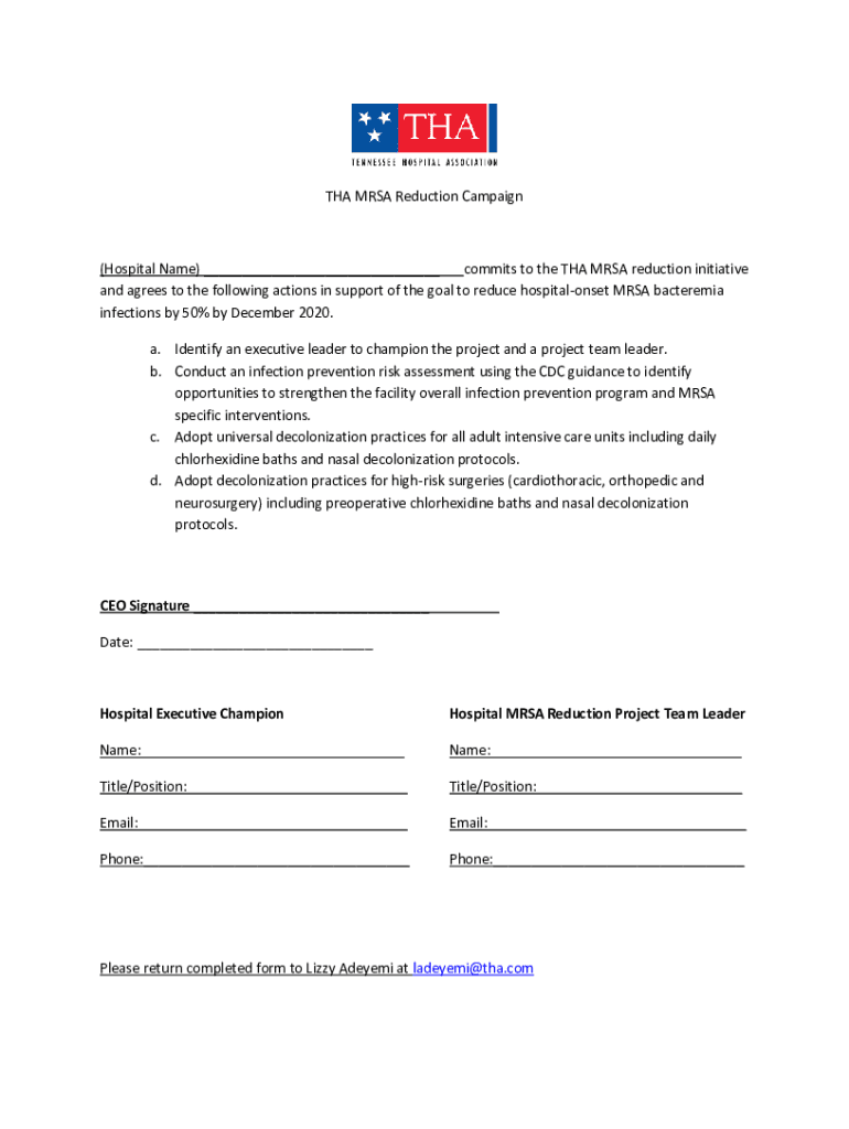 THA MRSA Reduction Campaign(Hospital Name) commits to the THA MRSA reduction initiative and agrees to the following actions in support of the goal to reduce hospital onset MRSA bacteremia infections