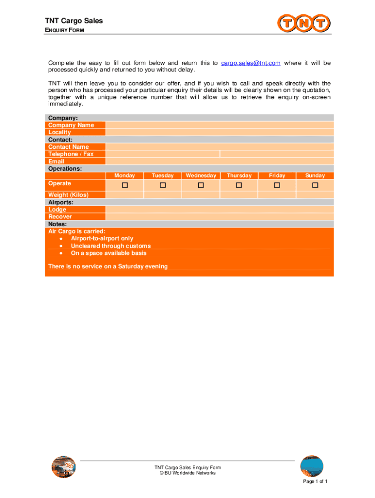 Tnt Cargo Sales Enquiry is not the form you're looking for?Search for another form here.