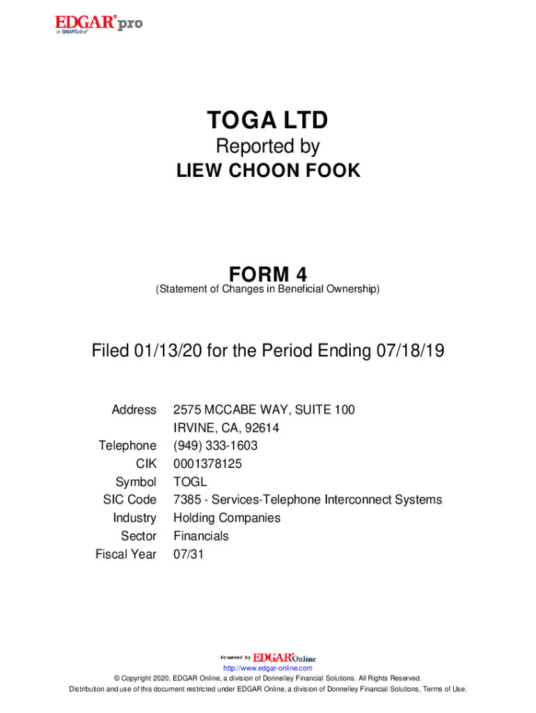 Get the free TOGA LTD. FORM 4 (Statement of Changes in Beneficial Ownership) Filed 01/13/20 for t...