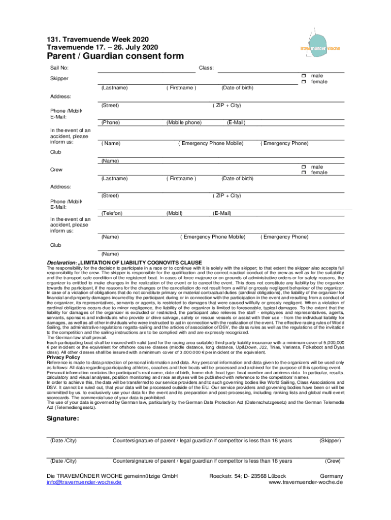 131. Travemuende Week 2020 Travemuende 17. 26. July 2020Parent / Guardian consent form Sail No:Class: Skipper (Last name)(First name)male female(Date of birth)Address: (Street)(ZIP + City)Phone /Mobil/